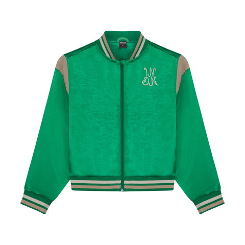 Details: Satijnen afwerking, groot borduursel op de achterkant, klein borduursel op de borst, volledig gevoerd, ritssluiting, geribde boorden met streep