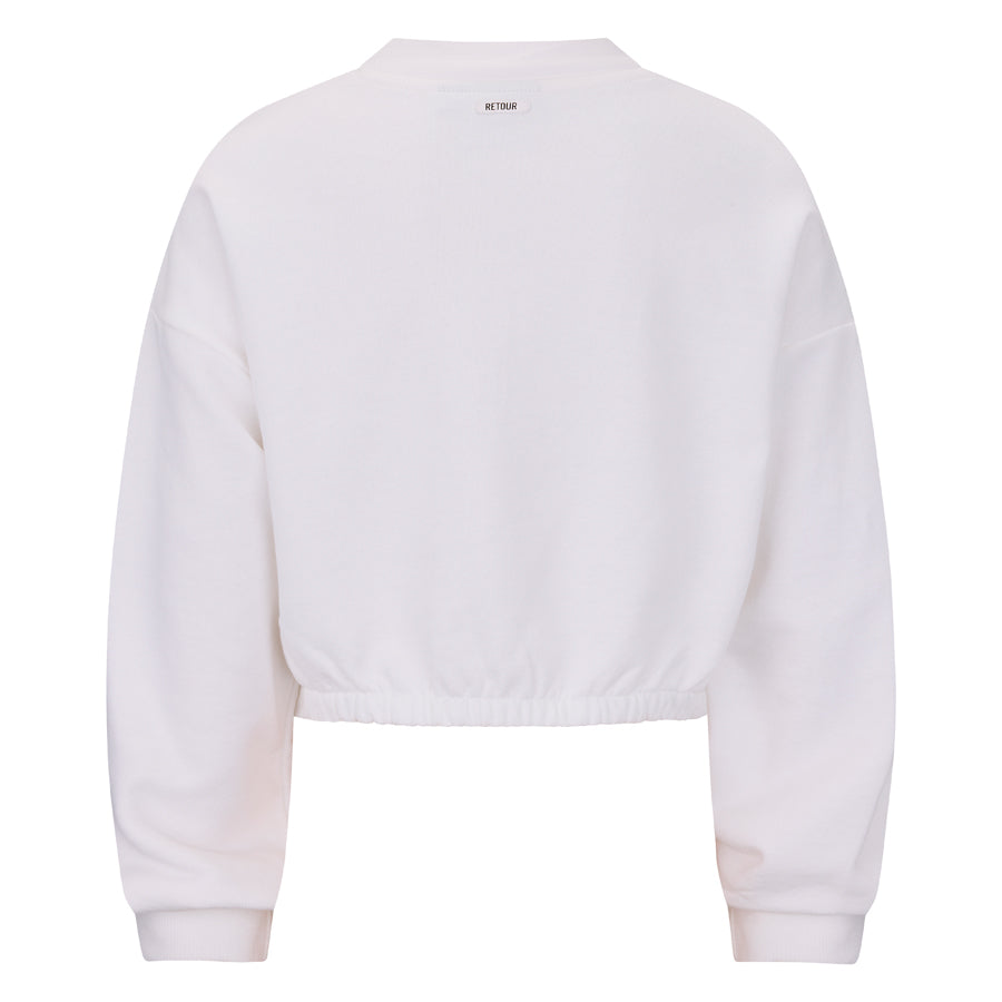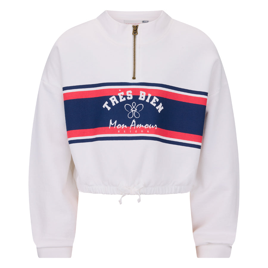 Korte sweater uit de zomercollectie van Retour Jeans met opstaande col met halve ritssluiting. De sweater heeft bekleed elastiek in de taille.